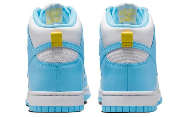 Take a step back in time with the Nike Dunk High Retro Blue Chill. This classic design is a great way to add some unique style to your wardrobe. The full smooth leather construction provides a sleek look while the Blue Chill hue gives this shoe extra edge. White serves as the base color, enhanced by Amarillo Yellow on the Nike branding, tongues, insoles and heel tabs for a vibrant finish. The white rubber midsole provides support and cushioned comfort so you can enjoy your day without sacrificing style or performance. The Nike Dunk High Retro Blue Chill is perfect for those who appreciate timeless designs but want something different from the rest of their collection. Put it on and prepare to be noticed.