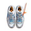 The Nike OFF-WHITE x Air Rubber Dunk is a special edition shoe that was created in collaboration with Virgil Abloh”s luxury streetwear brand. The shoe is a reinterpretation of the classic low-top basketball sneaker, and features design elements borrowed from the world of lifestyle running shoes. The upper part of the shoe is made from white mesh, with blue accents and metallic silver overlays. The bottom part of the shoe features a gum rubber cupsole with visible Air cushioning. Virgil Abloh”s personal stamp can be seen on the orange tab on the outlined Swoosh, and on the Helvetica text on the medial side panel.